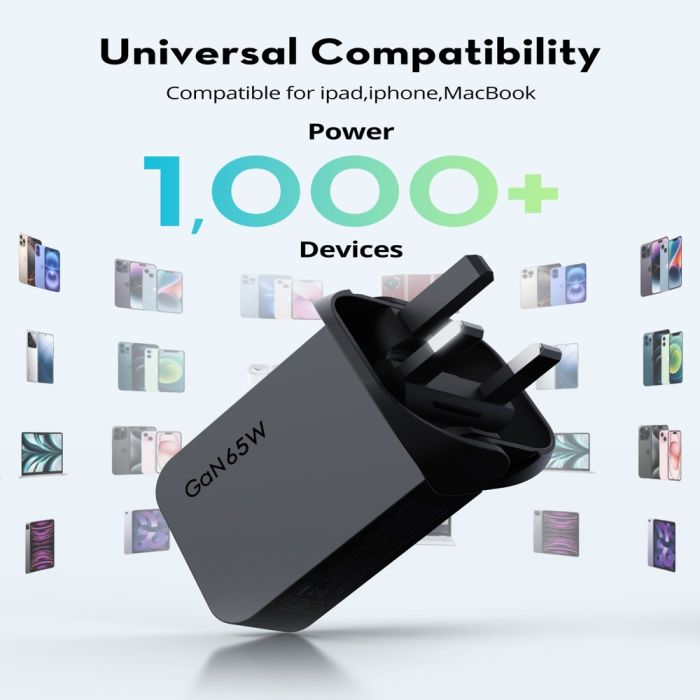 - GaN 5.0 Dual USB-C Wall Charger with a Total Power Output of 65W
