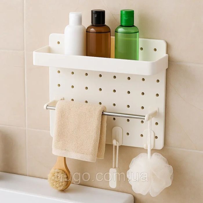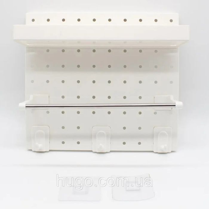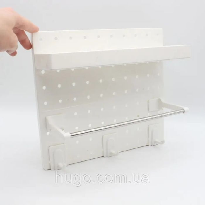 This wall organizer for kitchen and bathroom is made of plastic, giving your daily essentials an elegant organized look, with a top shelf, hanging bar, and lower hooks to keep your space neat and everything within easy reach