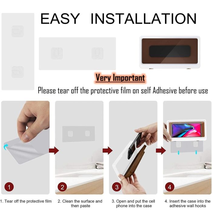 Use your phone safely and comfortably while showering or cooking with this waterproof wall-mounted phone holder. It allows you to watch videos, listen to music, or browse the news comfortably. Made of durable ABS and PET materials to ensure a splash- and water-resistant seal, it securely attaches to mirrors, bathroom walls, kitchens, and other smooth surfaces without drilling. It features a flexible 0.25mm touch screen, allowing you to control your phone without having to remove it. The high-definition anti-fog window provides a clear view of the screen, while the size fits phones up to 6.8 inches.