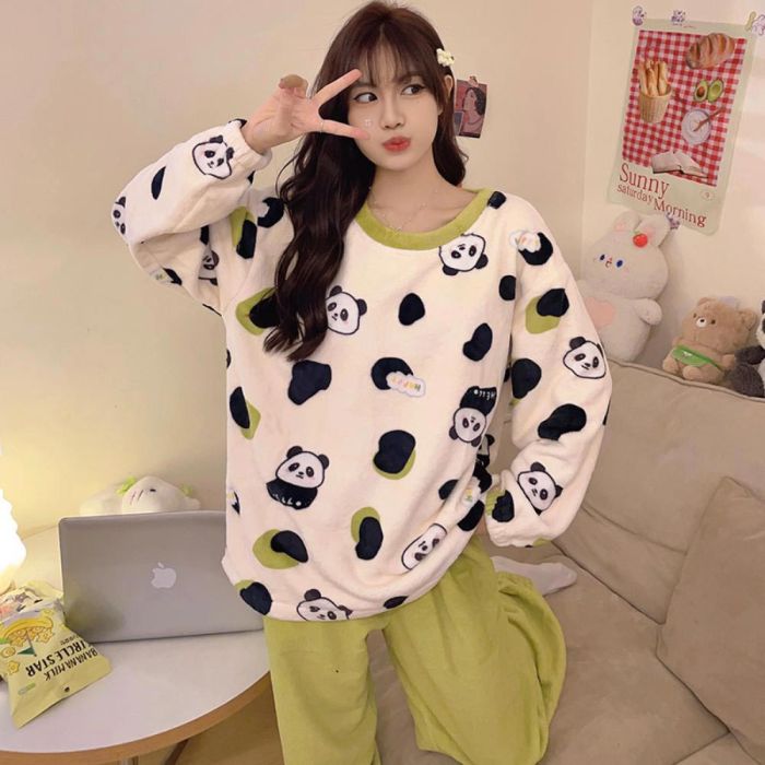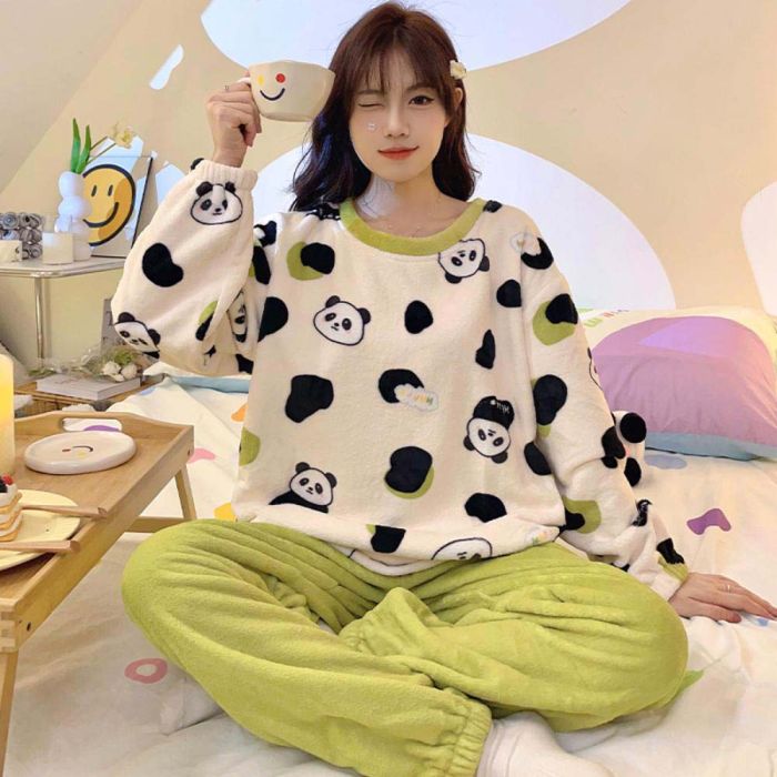 This Winter Panda Pajama Set For Women made from plush flannel that provides cozy warmth and a gentle feel on the skin, designed for comfortable home wear during cold weather, lightweight and maintains its quality with use