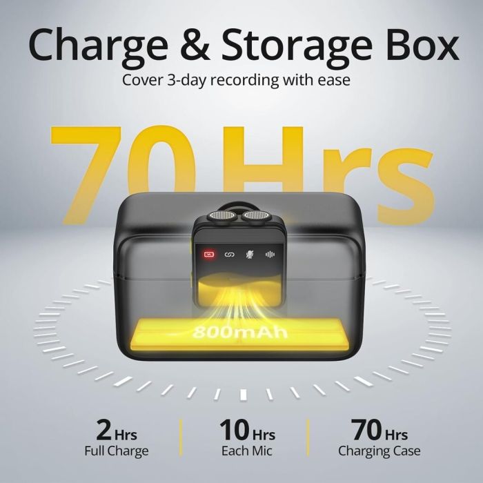 - Battery Life: 10 hrs/mic, 70 hrs total (case)