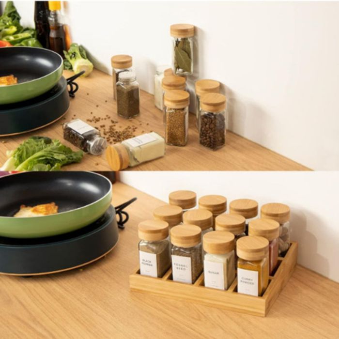 This Wooden spice organizer box with 12 compartments, perfect for organizing spices and herbs in the kitchen. Practical and elegant design that fits any space, easy to use and clean. Helps keep spices neat and easily accessible while cooking.