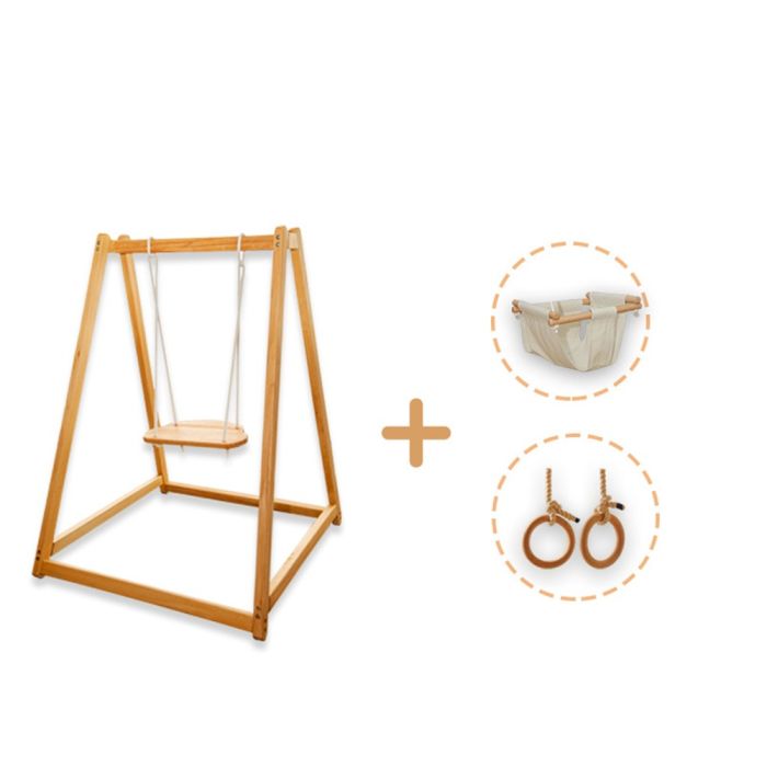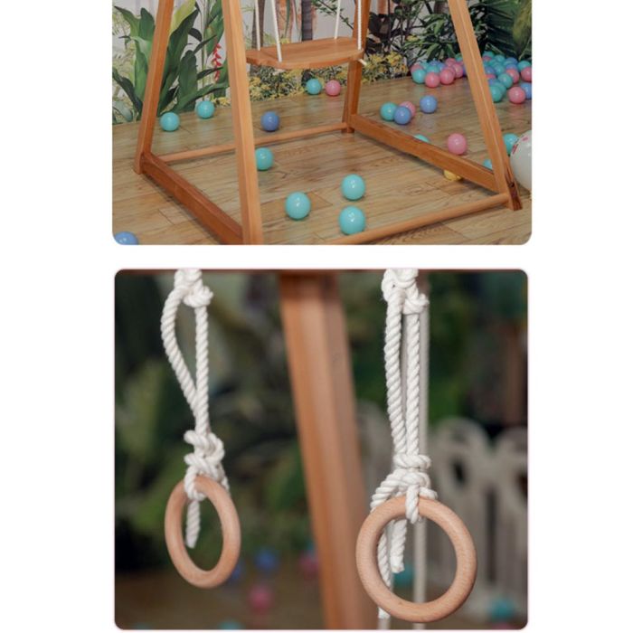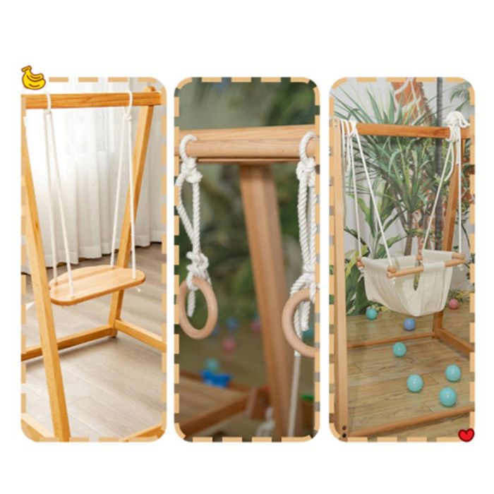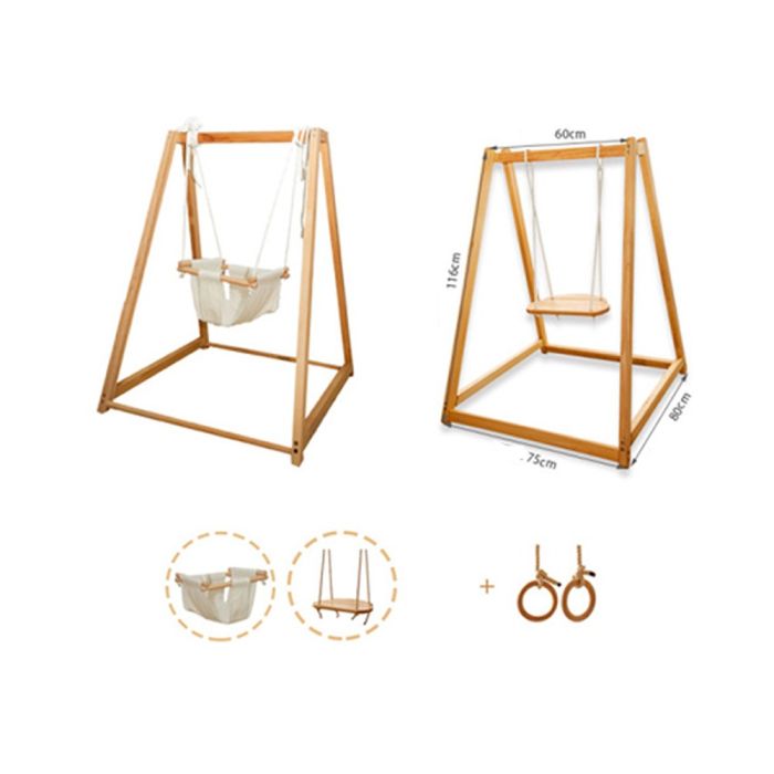This Wooden Swing Set For Kids 3 Pieces is made from durable wood with a safe finish, includes a wooden swing seat a fabric baby seat and hanging rings, stable design supporting active play, helping develop balance and motor coordination