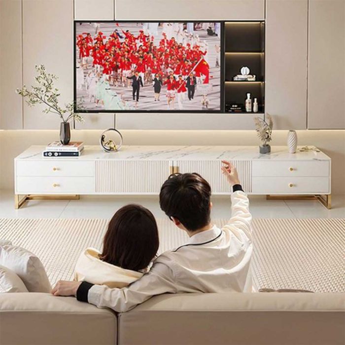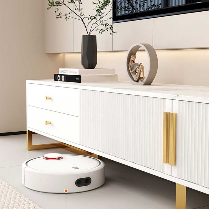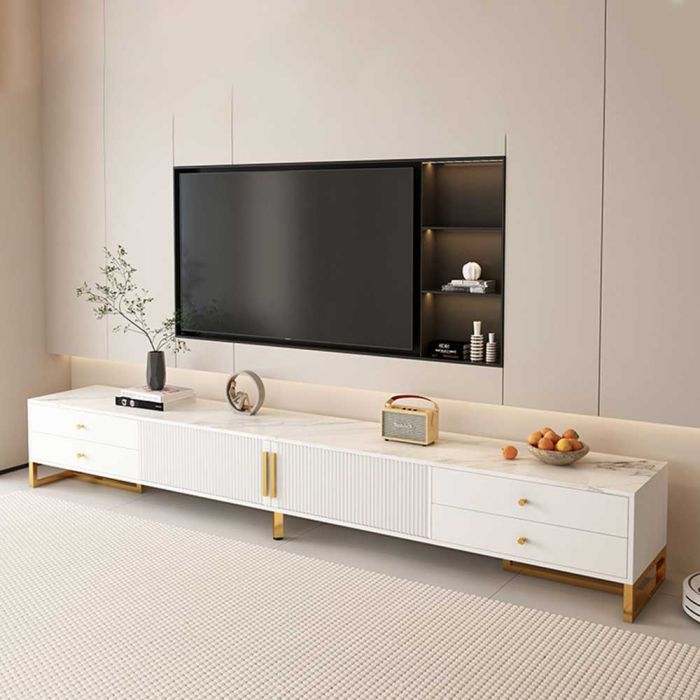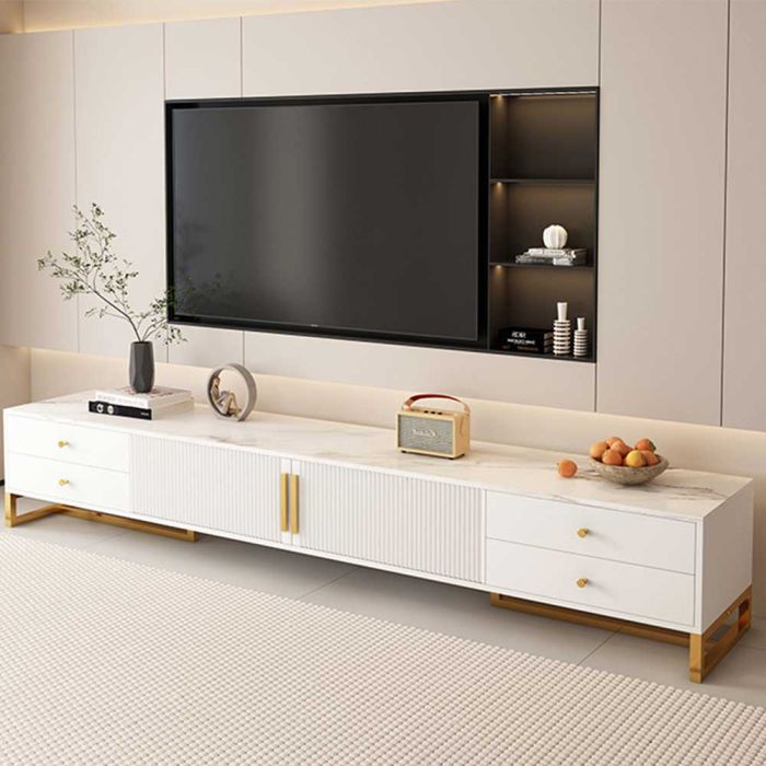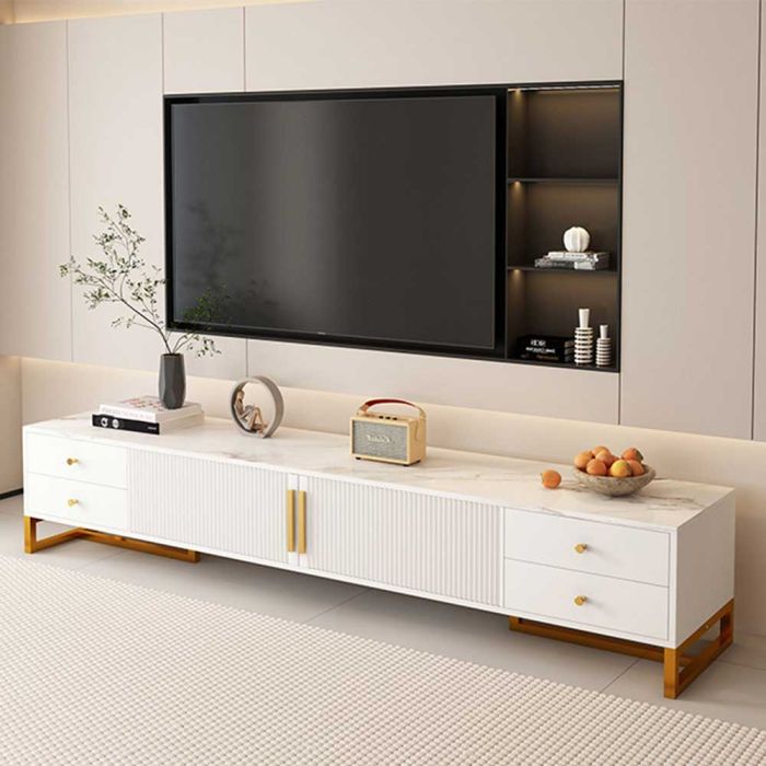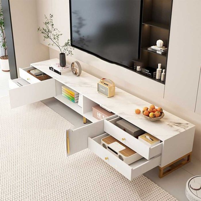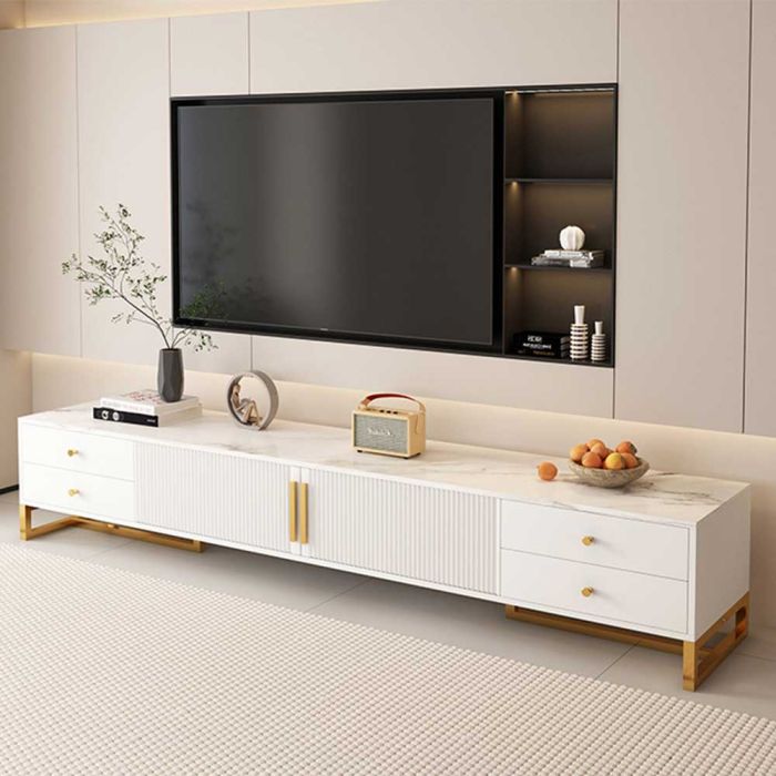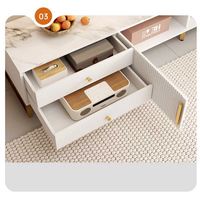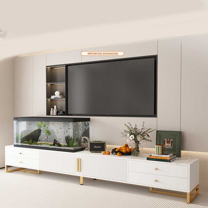 Upgrade and organize your home space with a Wooden TV Table with Shelves and Drawers made from durable wood with an elegant design, offering comfortable organization and a refined aesthetic touch, with organized storage spaces suitable for the living room and stylish display