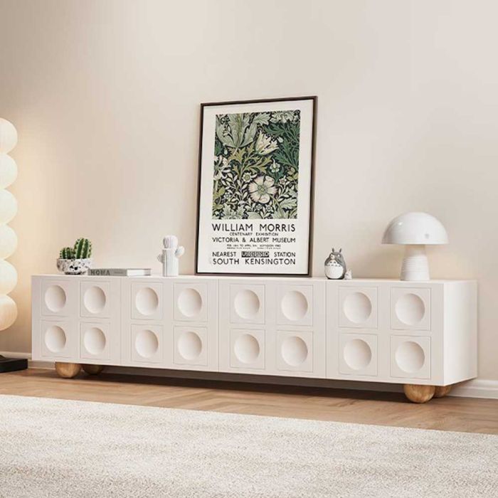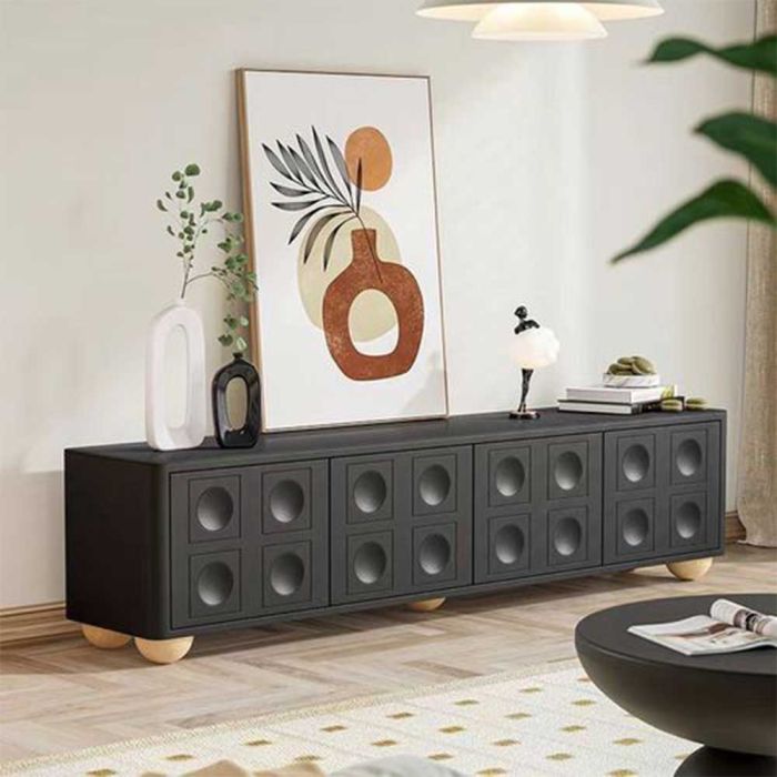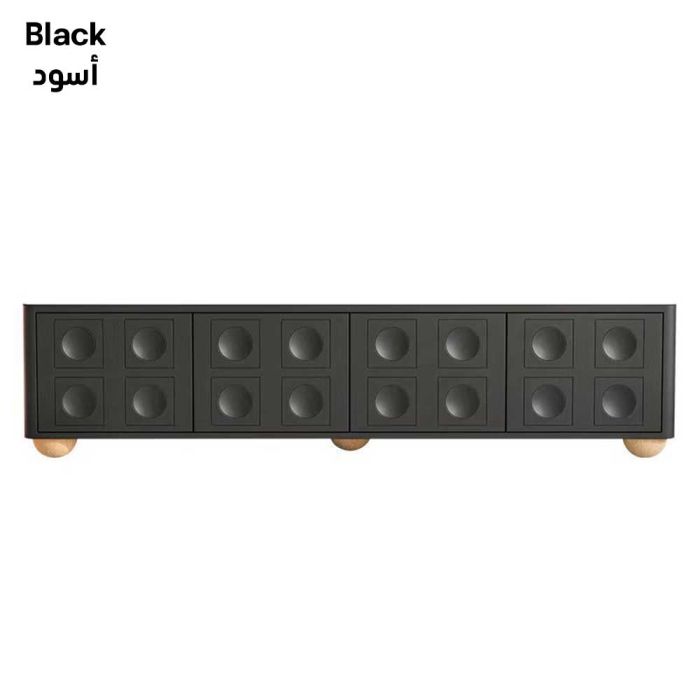 This Wooden TV Table with French Design and Doors made from durable wood with an elegant finish, offering calm organization and a refined aesthetic touch, with doors featuring internal organizing shelves to conceal items and maintain a harmonious living space