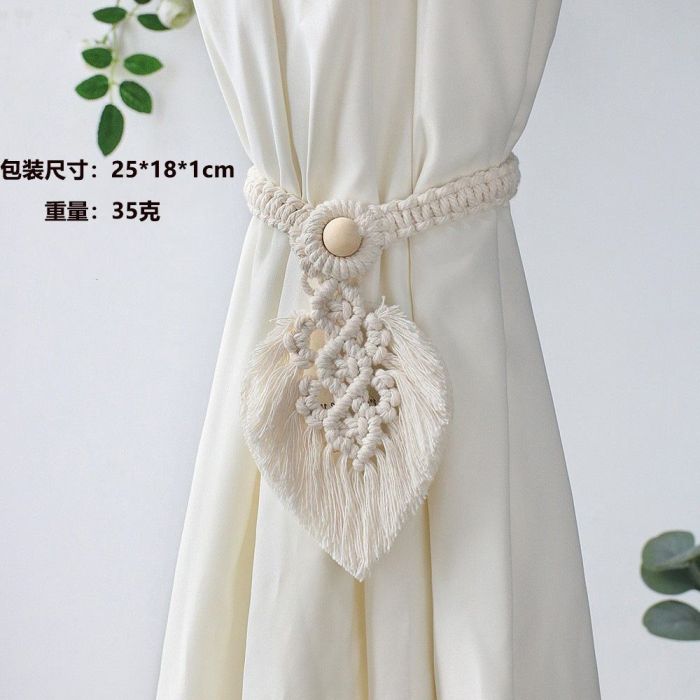 This Woven Bohemian Style Curtain Tieback made of natural cotton threads, featuring an artistic handmade leaf-shaped design, decorated with a wooden bead adding a warm bohemian touch, easy to use to hold curtains elegantly, maintains its quality and gives the room a cozy character.