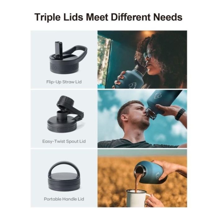 The Trio water bottle is designed with double-walled vacuum insulation technology to keep drinks cold for up to 48 hours and hot for up to 24 hours. Made of high-quality 18/8 stainless steel with a non-slip, eco-friendly coating, it is rust-resistant, oxidation-resistant, and odor-proof, making it the perfect choice for daily hydration. It comes with 3 different lids and a protective strap for easy carrying on the go or during workouts.