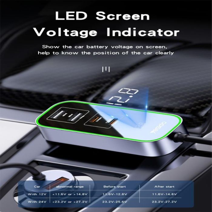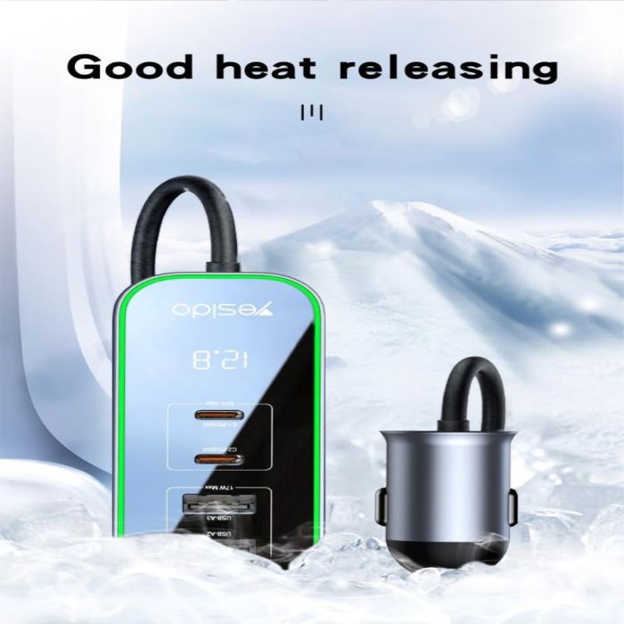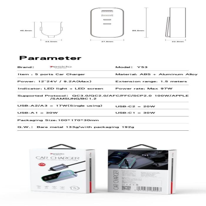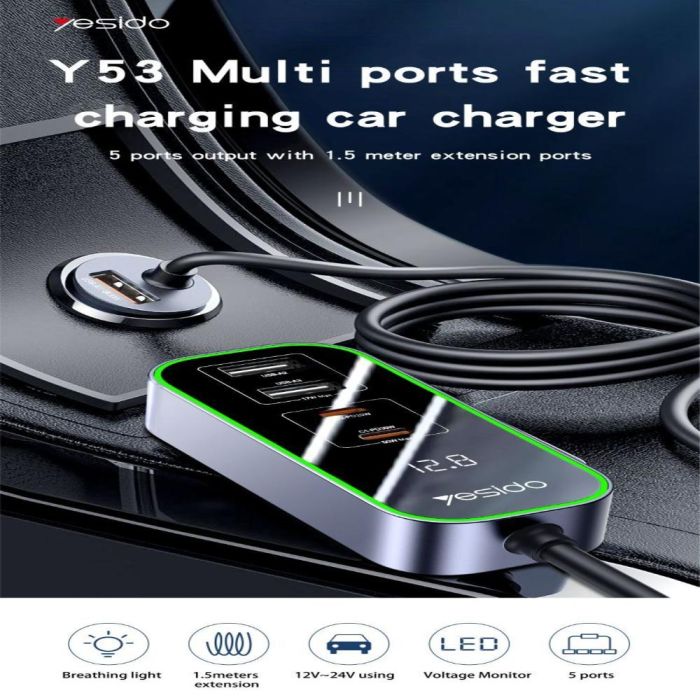 The Yesido Y53 car charger lets you safely and efficiently charge multiple devices simultaneously. It features five ports supporting fast charging protocols such as QC, PD, PPS, and SCP, as well as a smart LED display showing the current voltage. Made of high-quality ABS and aluminum alloy, it includes a 1.5-meter extension cable to easily reach all car seats.