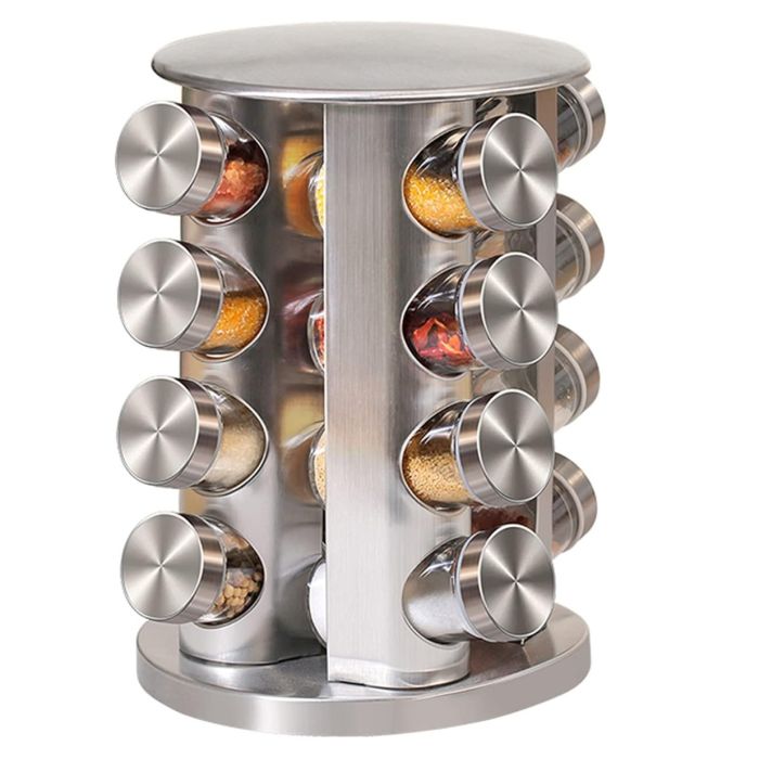 Keep your spices neatly stored and always within reach with this sleek steel spice carousel. Available with 12, 16 or 24 jars, it rotates smoothly for quick and easy access while cooking.