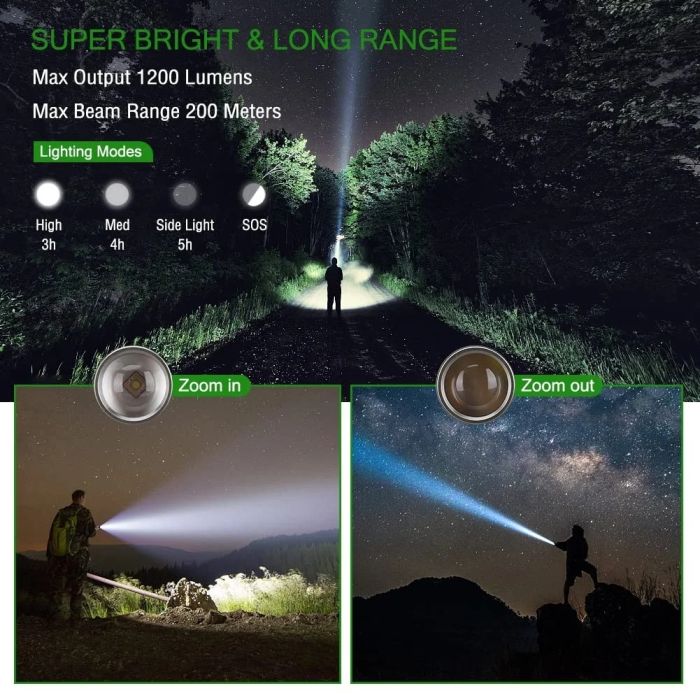 Multipurpose LED Light as it is effortlessly illuminate every corner of your house or campsite. There are 4 lighting modes: strong/medium/strobe/side light mode. Also offers a zoomable feature that helps you easily see bushes up to 550 yards away when you use the spotlight mode.